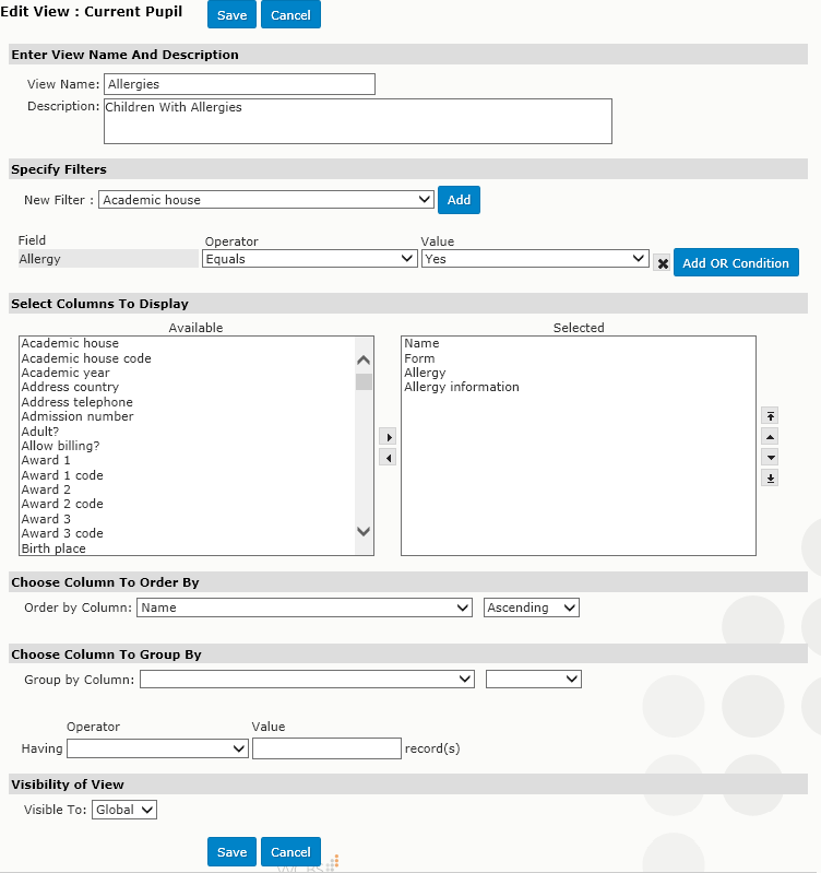 For example, in the Pupil function, you could define an 'Allergies' search view, in which you specify all those pupils with a known allergy. If you have the required permissions, you could then make this search view visible for other members of staff, ensuring that they also have a quick and easy method of retrieving a list of pupils with known allergies. In the search view, if you include the relevant fields for a range of methods in which pupils are grouped, such as academic houses, boarding houses, forms and years, then staff will be able to filter the list based on these criteria. For example, if a school trip is taking place for a specific form year, one would want to filter the 'Allergies' search view by form year for a complete list of known allergy sufferers.