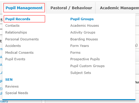 The Pupil Records function enables you to add new pupil records, and to search, view and edit existing pupil records. Depending upon permission settings, you can view, edit and complete a range of tasks via the Pupils screen, including the ability to:
