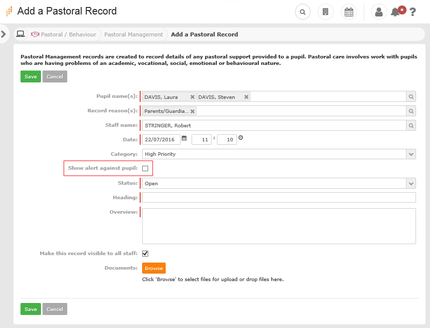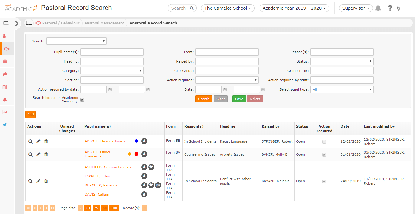 You can add pastoral records relating to individual or groups of pupils about the same incident or concern using the Pastoral Management module.